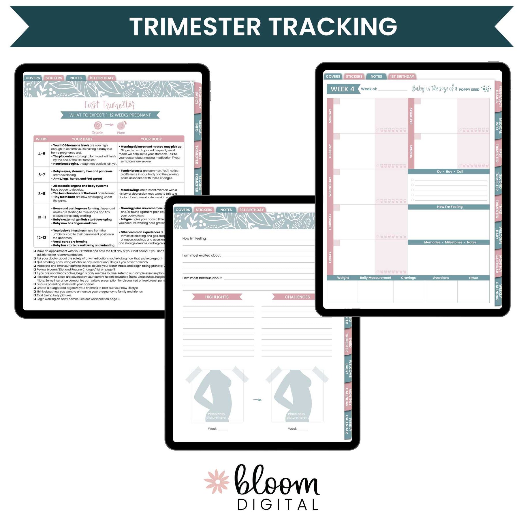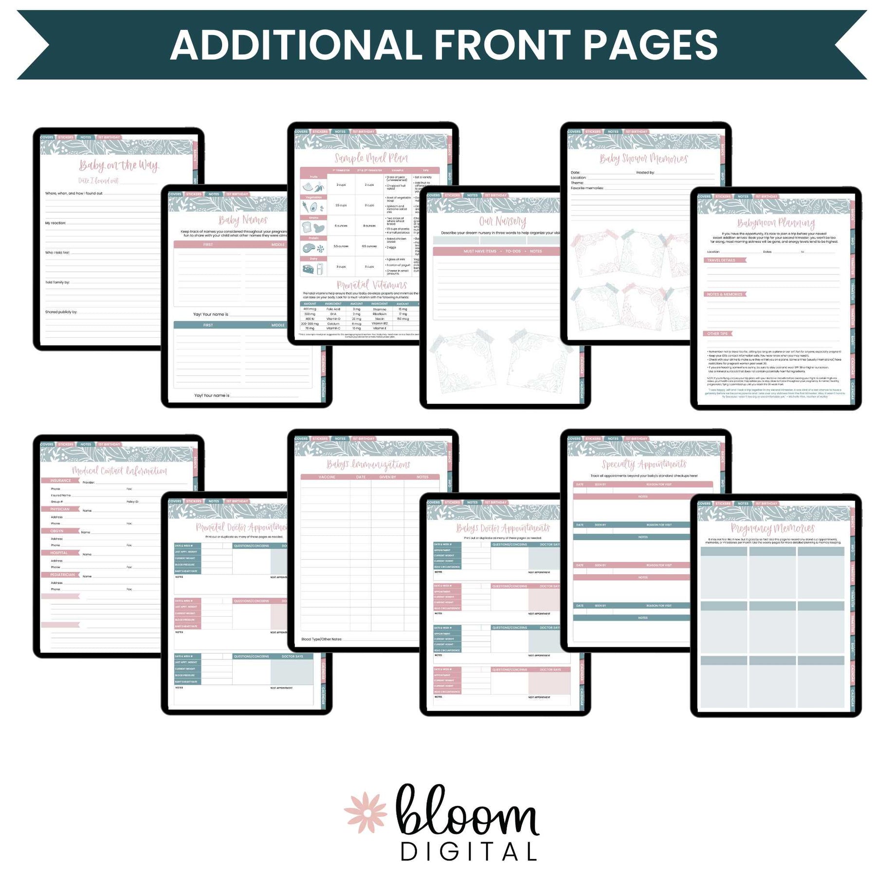 • Spaces for baby name ideas, doctor visits, feeding schedules, and more
