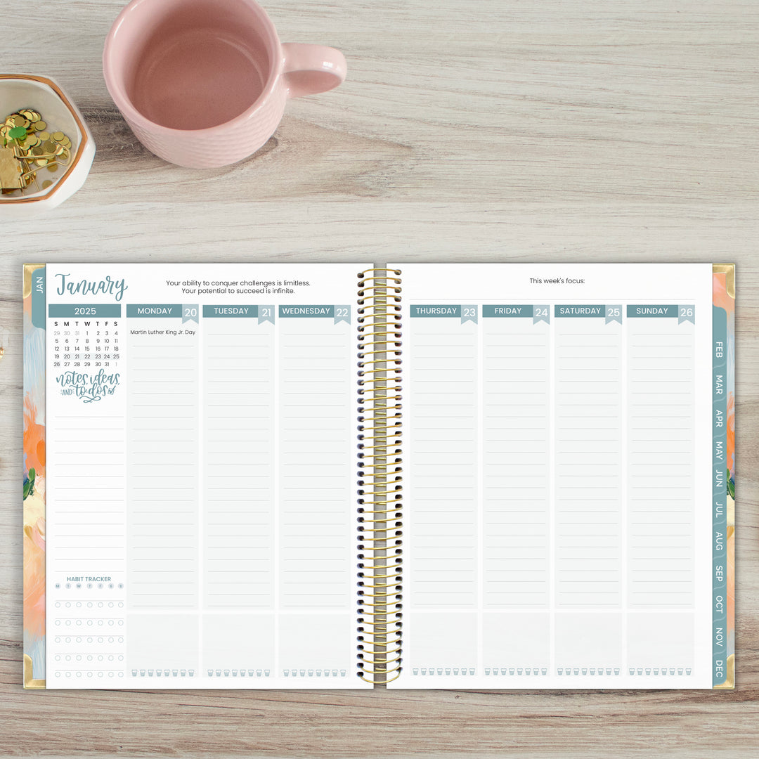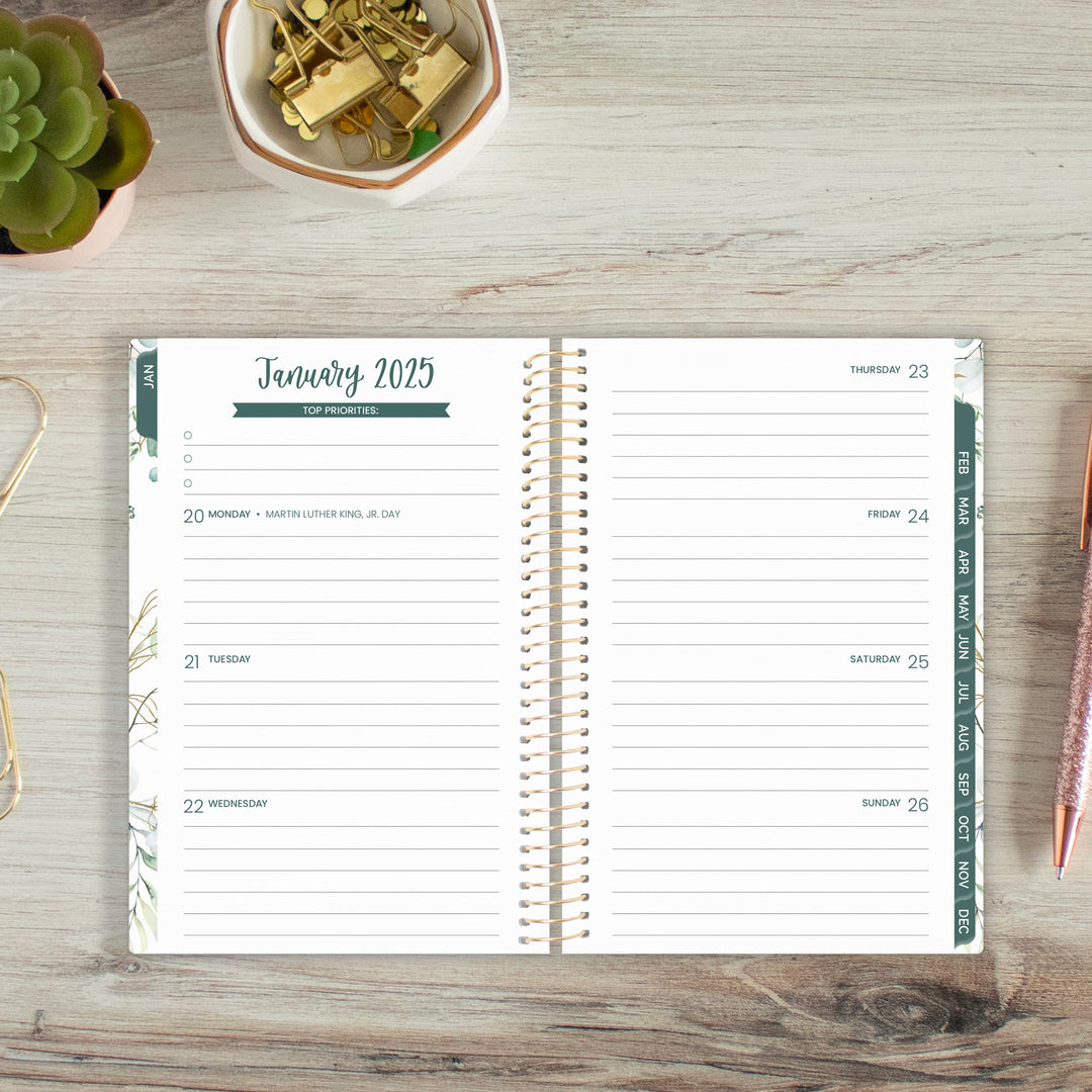Our most popular layout, this classic planner works for anyone who needs to manage their week on a 2-page spread that covers all 7 days of the week. This weekly layout comes in 5" x 8" and 8.5" x 11"